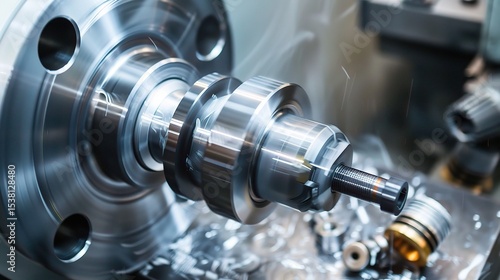 Close-up of machined part turning on a lathe, showcasing a metal component precision-cut by a carbide tool with chips flying and coolant spraying