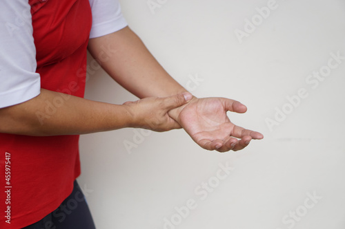 Closeup of male arms holding his painful wrist. Concept : wrist symptomatic Office Syndrome