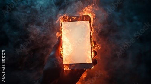 Close-up of male hand holds a burning smartphone with empty white screen on dark background.