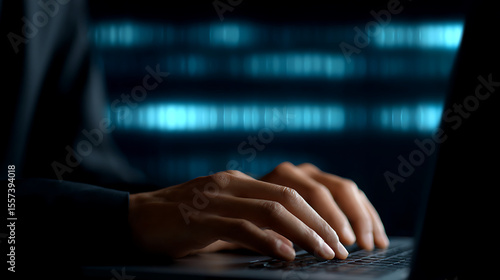 Close-up of man hands typing program code on laptop in dark office. Cyber criminal hacking corporate data. Concept of data theft, banking fraud, password cracking, network security vulnerability.