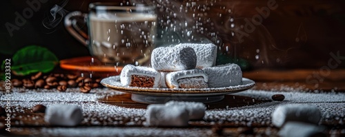 Close-up of marshmallows on a plate with coffee in the background, sprinkled with powdered sugar, creating a cozy and sweet atmosphere.