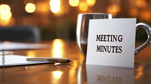 Close-up of meeting minutes on a desk, with a silver mug and a pen, creating a warm and focused atmosphere.