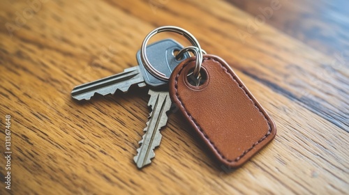 Close-up of Metal Keys with Brown Leather Keychain on Rustic Wooden Surface, Ideal for Home Security and Daily Life Concept
