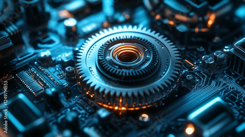 Close-up of metallic gears and circuits in blue light, symbolizing technological innovation, precision, and industrial machinery with a futuristic touch and space for text