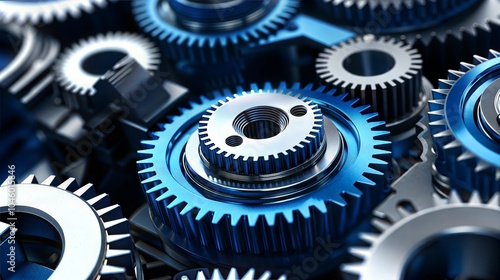 Close-up of metallic gears with blue accents on a white isolate background.