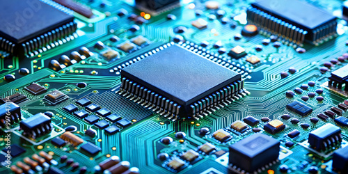 Close-up of microchips and electronic components, digital circuitry, technology, circuit board