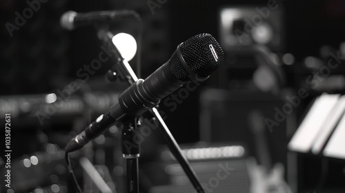 Close-up of microphone on stand in soundproof recording studio, positioned in front of script stand, symbolizing voice acting and audio production.