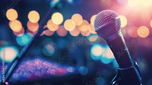Close-up of microphone on stand in soundproof recording studio, positioned in front of script stand, symbolizing voice acting and audio production.