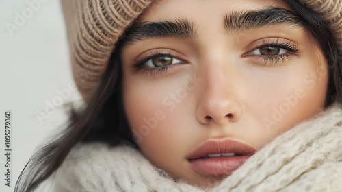 Close-up of model’s face with hat and scarf - Cozy and minimal