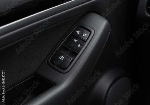 Close-up of modern car door controls, featuring buttons for window operation and central locking. The sleek, ergonomic design in a dark interior highlights contemporary automotive functionality and de