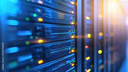 Close-up of modern server racks with colorful status lights and sunlight glow, highlighting uptime and connectivity. Ideal for IT infrastructure, hosting, and data network solutions