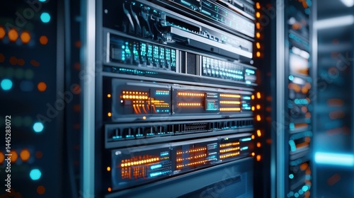 Close-up of modern server racks with illuminated indicators in a data center.