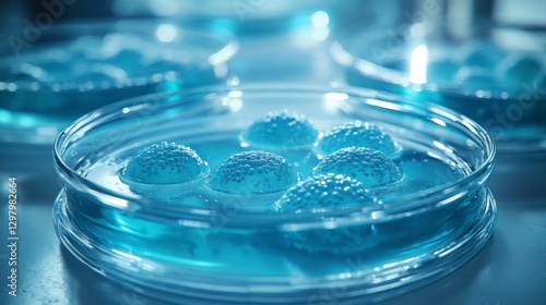 Close-Up of Multiple Fertilized Eggs in Petri Dish with Blue Solution in Laboratory Setting for IVF Research