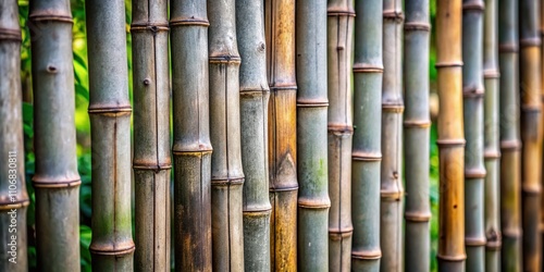 Closeup of Natural Monochrome Bamboo Sticks Forming a Unique Fence with Horizontal Gray Lines and Organic Textures, Perfect for Eco-Friendly and Tropical Background Designs