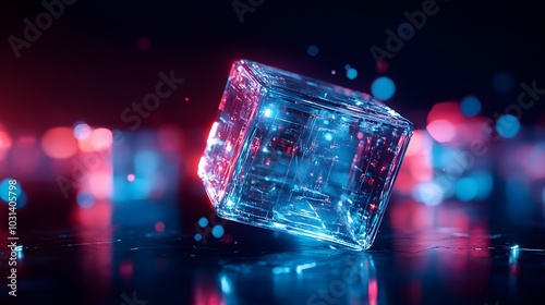 Close-up of neon geometric cubes and pyramids floating in cyberspace, glowing with bright blues and pinks, dark background, cyberpunk, digital painting, high contrast