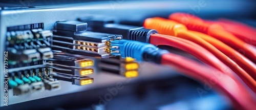 Close-up of network cables connected to a server, illustrating technology infrastructure.