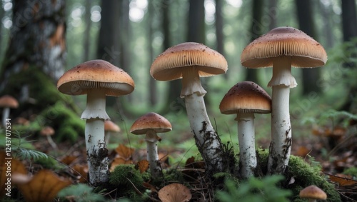Closeup of old mushrooms growing in a lush forest showcasing their unique textures and colors surrounded by greenery and fallen leaves.