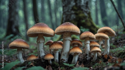 Closeup of old mushrooms in a misty forest showcasing natural textures and earthy tones with a serene atmosphere.