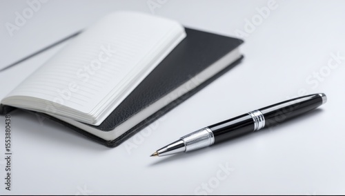 Close-up of open notebook with lined pages and black cover alongside a black and silver retractable ballpoint pen on smooth white surface for planning and note-taking background