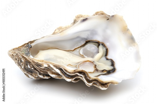 Close-up of open oyster shell with pearl inside. White background highlights beautiful, convoluted mother-of-pearl colours. Bivalve shell texture is intricate, with shiny orb inside.