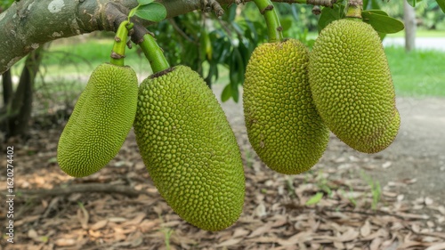 Close-up of oval jackfruits with rough bumpy surface on thick stems