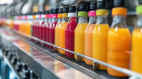Close-up of packaging station, juice bottles being grouped and wrapped, vibrant labels and barcodes visible, industrial setting