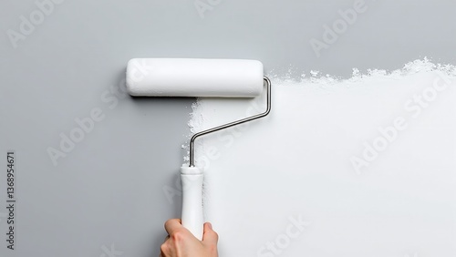 Close-up of paint roller applying fresh color to gray surface, showcasing home improvement and renovation process in action.
