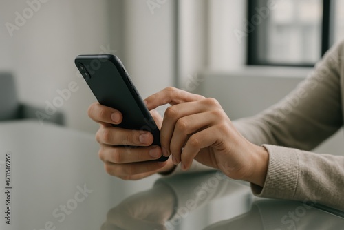 Close-up of Person Using Smartphone While Sitting at a Table in Modern Office Environment
