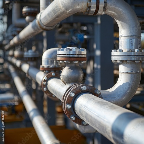 close-up of petroleum pipelines and a pipe rack, showcasing the industrial materials and connections in a bustling industrial zone, with a gritty aesthetic