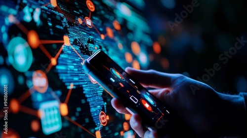 Close-up of phone in hand, floating global icons, neon digital connections, futuristic world map overlay
