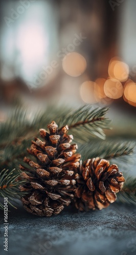 Close-up of pinecones with evergreen branches and soft, warm bokeh background