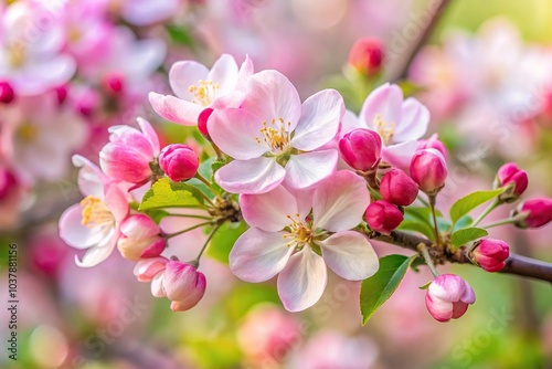 Close-Up of pink apple blossoms on a branch with spring flowering pink and white petals
