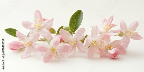 Close-up of pink cherry blossoms on a white background, showcasing the delicate beauty of spring flowers.