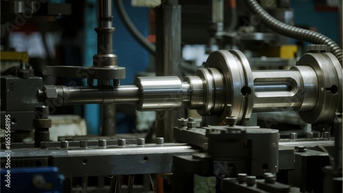 Close-up of precision machinery parts on assembly line with warm glow, showcasing advanced manufacturing technology and industrial automation process.