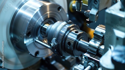 Close-up of precision turning operation on a CNC lathe, showcasing a metal workpiece being meticulously shaped with micron-level accuracy