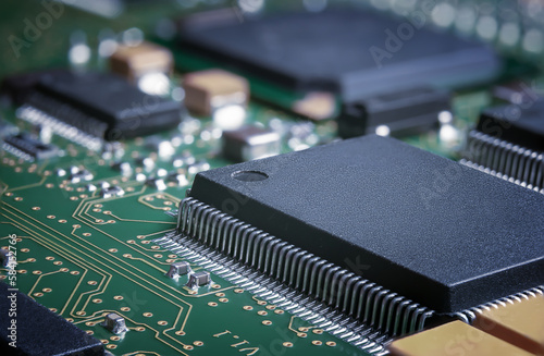 Closeup of Printed Circuit Board with processor, integrated circuits and many other surface mounted passive electrical components.