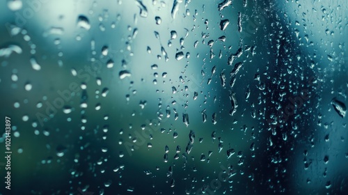 Close-up of raindrops on a window, creating a blurred, moody atmosphere.