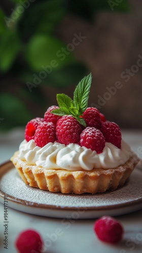 Close-up of raspberry tart with cream mint and fresh raspberries on a plate in natural light setting