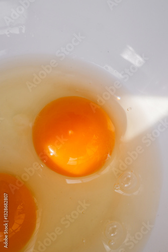 Close-up of raw egg yolks in a white bowl, illuminated by natural light. The golden, glossy texture of the yolks contrasts with the translucent egg whites, creating a fresh and organic food