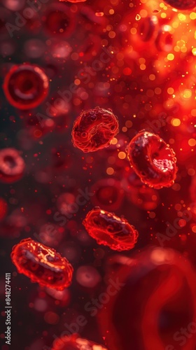 Close-up of red blood cells in motion, illustrating the intricate details and vibrant colors within the human circulatory system.