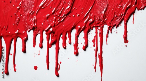 Close-up of red paint dripping on a white background vibrant contrast with minimal details focusing on the fluid motion and texture.