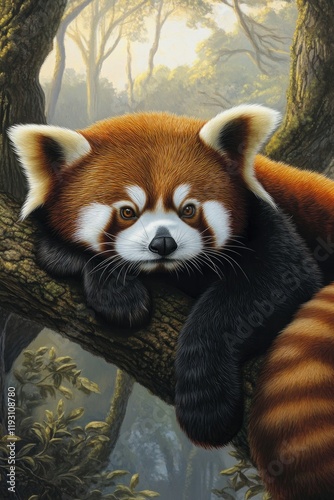 close-up of red panda resting on tree branch with its fluffy tail draped over edge