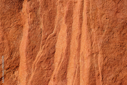 Close-up of red sandstone rock texture featuring natural wavy patterns and rough surface.