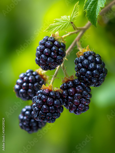 Close-up of ripe blackberries hanging from a branch with vibrant green leaves and a blurred natural background, highlighting the juicy, dark berries in a fresh outdoor setting