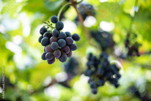 Close-up of ripe grapes hanging on a vine with blurred green leaves