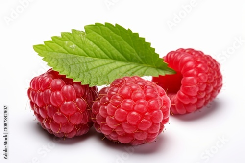 Closeup of ripe raspberry with green leaves isolated on white background, detailed macro shot