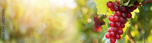 Close-up of ripe red grapes hanging on a vine in a vineyard with a blurred natural background and sunlight.