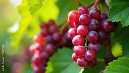 Close-up of ripe red grapes ready for winemaking, nestled amongst green leaves , rich, leaves, deep