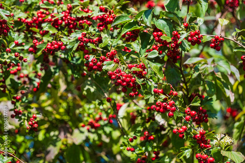 Close-up of ripe red rose hips on a hedge at the edge of a meadow orchard in the Taunus