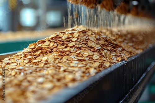 Close-up of Rolled Oats on a Conveyor Belt in a Factory
